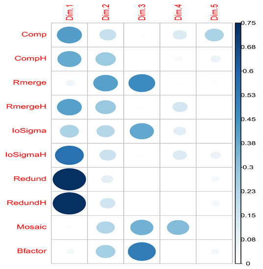 We can now analyze how much each indicator contributes to each dimension, although for our purpose, it is enough to consider just the fifth dimension, which already explains more than 90% of the variance. Figure 5 (Table S9) shows the contribution of each of the ten indicators analyzed in the direction of the first five dimensions. Dimension 1 is mostly in the direction of redundancy (overall and high resolution) and intensity over noise (mainly overall) with important contributions of completeness and R-merge at high resolution. Dimension 2 is relatively aligned with overall R-merge, completeness, and R-merge at high resolution. B-factor also contributes significantly.