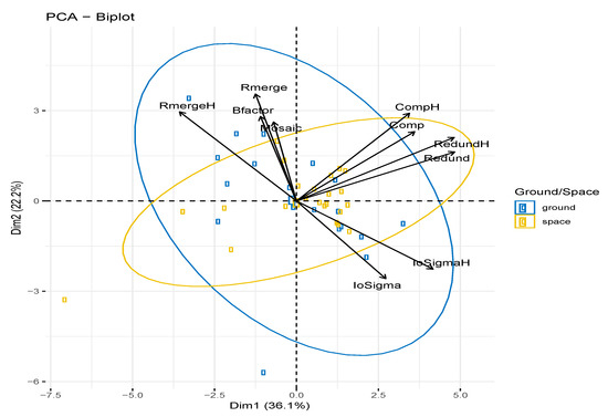 We can now summarize the results of the principal component analysis of our set of indicators in a single representation. Figure 6 represents the contribution of the ten indicators to the first two dimensions (58.3% of the variance of the datasets). As anticipated, indicators are highly correlated, showing as nearby vectors, with completeness and redundancy (overall and high resolution in both cases) making a set of highly correlated values. R-merge, intensity over noise, B-factor, and mosaic spread fall into a second set of highly correlated indicators (negatively correlated in the case of intensity over noise because the value increases for higher quality, while those of the other correlated indicators decrease). The space-grown crystals showed larger variance along the completeness/redundancy axis while ground crystals were less spread in this direction and showed larger spread along the R-merge, B-factor, mosaic spread and intensity over noise directions. In any case, the differences between the indicators of the two groups are small.
