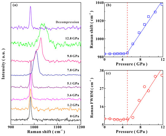 (a) The Raman spectra of the epsomite under a high pressure, up to ~12.8 GPa, and at room temperature, collected in the frequency range of 900–1200 cm−1; (b) the pressure dependence of the Raman shift for the ν1 (SO4) mode; (c) the full width at half maximum (FWHM) of the ν1 (SO4) peak as a function of the pressure.