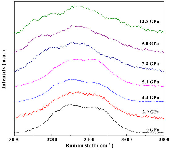 Figure 1a displays the high-pressure Raman spectra of the epsomite in the SO4 vibrational mode range at pressures of 0–12.8 GPa and room temperature. The corresponding pressure shifts for the ν1 (SO4) mode are plotted in Figure 1b, from which one obvious inflection point can be obtained, at a pressure of ~5.1 GPa. From ~0 to ~5.1 GPa, the vibrational mode of ν1 (SO4) slightly shifts towards the higher wave numbers, with a slope of 0.16 cm−1 GPa−1. However, upon further compression from ~5.1 to ~12.8 GPa, the ν1 (SO4) mode exhibits a strong pressure dependence with a relatively high slope value of 4.46 cm−1 GPa−1. In the meantime, it can be seen that the full width at half maximum (FWHM) of the ν1 (SO4) peak also shows a discontinuous change at the same pressure point of ~5.1 GPa. As shown in Figure 1c, the FWHM of the ν1 (SO4) band remains at an almost constant value of about 8.3 cm−1 below ~5.1 GPa, but it gruadally increases with pressure above ~5.1 GPa. Figure 2 shows the Raman spectra of the epsomite in the OH-stretching mode range under a high pressure and room temperature. Obviously, both of the two OH-stretching peaks at 3322.6 and 3458.4 cm−1 suddenly shift to lower frequencies above ~5.1 GPa. Upon decompression, the Raman spectra for the recovered epsomite exhibit a similar characterization to those of the starting sample.