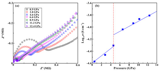 (a) The typical impedance spectra for the epsomite, measured at 0.5–12.4 GPa and room temperature; (b) the calculated electrical conductivity of the epsomite with increasing pressure.