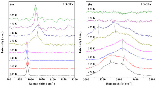(a) The temperature-dependent Raman spectra of the epsomite at ~1.3 GPa for the sulfate internal vibration; (b) the high-temperature Raman spectra of the epsomite at ~1.3 GPa for the hydroxyl-stretching vibration.