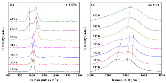 (a) The Raman spectra of the epsomite at 293–623 K and ~6.4 GPa in the sulfate vibrational range; (b) the collected high-temperature Raman spectra of the epsomite at ~6.4 GPa in the hydroxyl-stretching vibrational range.