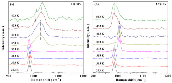(a) The high-temperature Raman spectra of the epsomite at a pressure of ~0.8 GPa; (b) the Raman spectra of the epsomite with an increasing temperature at ~3.7 GPa.