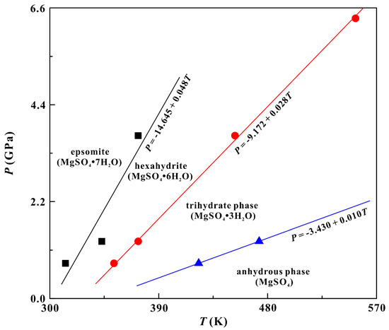 On the basis of the data of dehydration temperatures obtained from the high-temperature and high-pressure Raman scattering experiments, a P-T phase diagram for epsomite was well established at a wide temperature range of 293–623 K and at pressures of 0.8–6.3 GPa. As shown in Figure 7, it is verified that the dehydration temperature of epsomite gradually increased with the rise in pressure. This positive relation between dehydration temperature and pressure was coincident with the result of other similar hydrated sulfates (gypsum, chalcanthite and blödite) [11,12,13]. In addition, we also found that the epsomite undergoes three-step dehydration reactions in the heating process: from epsomite (MgSO4·7H2O) to hexahydrite (MgSO4·6H2O) to magnesium sulfate trihydrate (MgSO4·3H2O) to anhydrous magnesium sulfate (MgSO4). The anhydrous MgSO4 has been studied and it is stable up to 17.5 GPa [26]. The dehydration sequence of the epsomite revealed in this study is different from the result reported by Brotton et al. [27]. They observed the direct formation of magnesium sulfate trihydrate without the occurrence of hexahydrite in the heated epsomite at room pressure. This discrepancy was possibly caused by some crucial factors, such as the heating rate, relative humidity and pressure condition, all of which have been demonstrated to significantly influence the dehydration process of hydrous minerals [9,28,29,30]. Furthermore, three dehydration boundaries were determined by the linear fitting of these data. The epsomite-hexahydrite dehydration boundary was determined to be P (GPa) = –14.645 + 0.048 T (K), and the dehydration boundary for the transformation from hexahydrite to magnesium sulfate trihydrate corresponded to P (GPa) = –9.172 + 0.028 T (K). As for the last dehydration reaction, from magnesium sulfate trihydrate to anhydrous magnesium sulfate, the corresponding boundary can be described by a linear equation: P (GPa) = –3.430 + 0.010 T (K).
