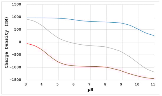 Charge density calculated from the amino acid composition (human serum albumin). Red line: positive charge density; gray line: negative charge density; blue line: total charge density. Based on the amino acid composition of the protein sample, not only the molecular weight, but also the electric charge number at a specific pH, can be calculated [11]. Additionally, the electric charge density can be calculated by dividing this electric charge number by the estimated lattice volume [10].