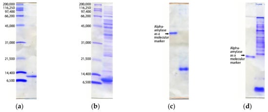 The proteins can be analyzed by their molecular weight (Figure 3a,b) [12,13]. SDS-PAGE is the method most commonly employed for checking the purity of protein samples. It is important to check whether the band clearly migrates to a position corresponding to the molecular weight calculated from the target protein sequence. When some minor bands emerge or when the main band seems doubled, a heterogeneous component of the molecular weight exists in the prepared sample. In this case, some of the expressed protein molecules have likely been modified during the expression/purification process.
