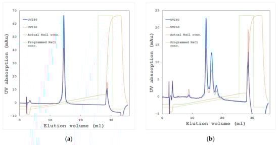 Proteins are analyzed by the affinity to ion exchange resin column [15,16]. High-resolution ion exchange chromatography separates proteins with differences in their surface charges. Samples that can give a sharp and clear peak and elute at an expected concentration of sodium chloride (Figure 5a) often give high-quality crystals. On the other hand, proteins that elute as multiple peaks (Figure 5b) contain unexpected problems, and crystallization tends to be difficult. When the heterogeneity of a sample is shown in Native-PAGE and two-dimensional electrophoresis, these samples rarely give one sharp peak on a chromatogram. However, a sharp peak is sometimes observed in chromatography, even when non-uniformity of the electric charge is observed in the results of the Native-PAGE and two-dimensional electrophoresis. It is conceivable that the forming aggregate might not be dissociated during chromatographic separation. This will result in a significant difference between the sodium chloride concentration (where the peak is eluted) and the calculated charge density of the target protein.