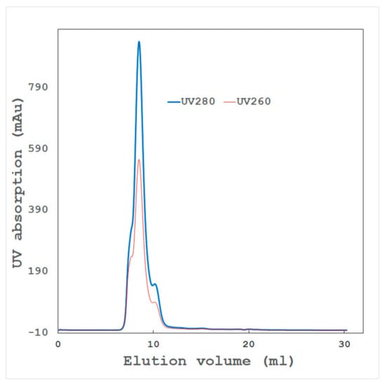 Typical chromatogram of gel filtration chromatography. A supramolecule protein with a molecular weight of 750,000 (pI = 5.8) was applied. Blue and red lines show the UV absorption of 280 and 260 nm, respectively. Proteins are separated with differences in their molecular weights. Various size beads have been developed for each molecular weight. The leading and trailing shoulders of the main peak suggest the existence of different molecular weight components. After removing these components, the crystal quality was improved.