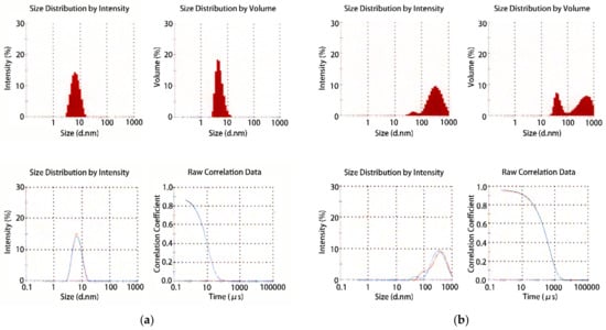 Typical results of dynamic light scattering (DLS) calculated by an autocorrelation function. (a) An appropriate sample of a soluble protein with a molecular weight of 25,000 (pI = 5.8) shows a narrow and mono-modal distribution; (b) a heterogeneous sample of the same protein shows a broad and poly-modal distribution. Using DLS, it is possible to determine what the molecular size distribution is like in the solution. The points to be confirmed from the obtained results are whether the estimated molecular weight is equal to the integral multiple of its own molecular weight with a narrow distribution of size and whether there are no large-sized particles (mono-modal distribution) [17].