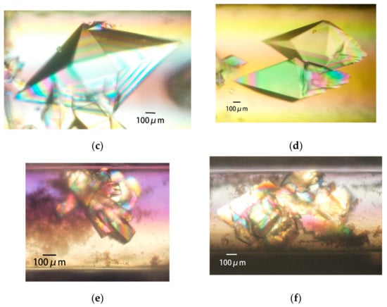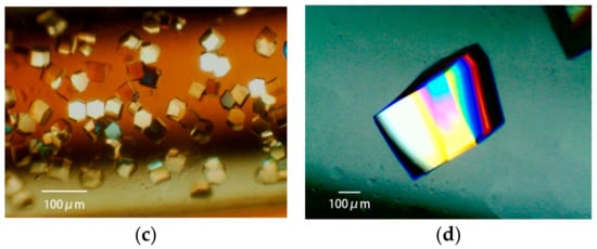In the dialysis (DL) method, the precipitant molecules in the reservoir solution gradually permeate to the protein solution through a dialysis membrane, resulting in an increasing supersaturation level of the protein to grow crystals. This method also replaces the coexistence of components with the protein sample in the reservoir solution while suppressing diffusion leakage of the protein molecules via the membrane [37,38]. Therefore, the concentration of the reagent components, related to the crystallization conditions, can be individually controlled, like the CD method. In the general DL method, the microdialysis button is used [2,37]. In this method, since the reservoir solution diffuses into the container immediately, problems like the generation of bubbles accompanying a sudden change in osmotic pressure are likely to occur. Recently, we developed a dialysis method with a diffusion path with a dialysis membrane attached to the opening end of the CD method capillary, thereby achieving dialysis under mild conditions [31]. A crystal obtained by the DL method in a capillary is shown in Figure 8d. Few studies use the DL method. However, having a better understanding of the mechanism above when setting conditions, as in the CD method, is a good way of setting more optimal crystallization conditions.