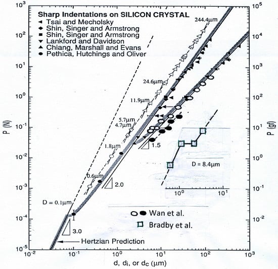 Figure 1 provides a background log/log compilation of indentation load, P, vs. surface-projected contact diameter, d, spanning a range from pioneering nano-indentation measurements to micro-scale indentation fracture mechanics test results obtained on silicon crystals, as identified in the top-left corner of the figure []. The figure was constructed to illustrate a d3 dependence of load for elastic contact in pioneering nano-indentation measurements made by Pethica, Hutchings, and Oliver [], as compared with an expected d2 dependence for a constant material hardness; D is the actual or effective spherical tip diameter for each indentation. The dc3/2 dependence applies for crack tip-to-crack tip measurements across the enclosed indentations.