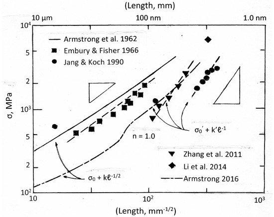 - Armstrong, R.W.; Conrad, H.; Nabarro, F.R.N. Meso-to-nano-scopic polycrystal/composite strengthening. In Mechanical Properties of Nano-Structured Materials and Nano-Composites; Ovid’ko, I., Pande, C.S., Krishnamoorti, R., Lavernia, E., Skandan, G., Eds.; Mater. Res. Soc.: Warrendale, PA, USA, 2004; pp. 69–77. [Google Scholar]
