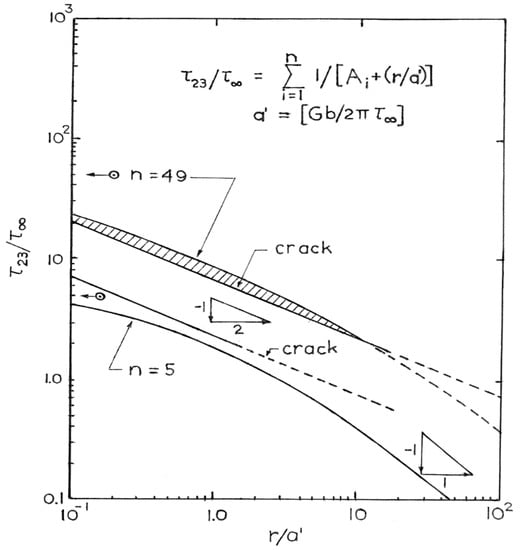 Figure 3 provides a comparison of the stress concentrations at a distance, r, ahead of two pile-ups and cracks for 5 and 49 dislocations in the pile-ups []. In the model figure description, τ23 and τ∞ are the local shear stress and applied shear stress; Ai is dislocation position within the pile-up divided by the characteristic length, a’ = Gb/2πτ∞, in which G is the shear modulus and b is dislocation the Burgers vector. The n = 5 and n = 49 open circles point to the level of the stress ratios at the pile-up tips. The Griffith stress concentration follows an r−1/2 dependence as expected and is approximately followed at small (r/a’) by the forward pile-up stress concentration. At large (r/a’), the pile-up stress concentration is seen to follow an r−1 dependence as is sometimes employed to represent the pile-up as a multiple Burgers vector dislocation of strength, nb.