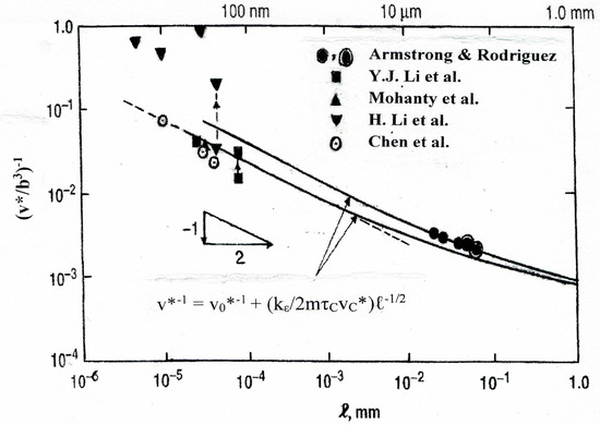 The current Figure 4 is an added-to version of a previous description of copper and nickel measurements in which a comparison was made with the Hall–Petch type grain size prediction given in Equation (1) []. The upper curve in the figure is for T = 195 K and the lower curve for 300 K. Transition from grain size strengthening to weakening is shown to occur in the smaller grain size regime at the “jump” in the filled-triangle values of (1/v*). The unmistakable jump by an approximate order-of-magnitude leads to v* values of near atomic dimensions that are generally determined for higher temperature (creep) deformations. However, additional open circle points shown in the figure, as obtained from measurements reported by Chen et al. [], are seen to follow the H–P grain size strengthening prediction. The positions of these points near to the H–P dependence are significant in terms of the grain boundary structures being stable and continuing to resist slip transmission from within the grains. These same authors provided confirmation of H–P grain size strengthening via separately reported hardness measurements. In related research on nano-grained copper and nickel materials, Zhou et al. have given emphasis to the importance of establishing thermal stability of the grain boundary structures in such materials []. Otherwise, Figure 4 shows v* to be an effective monitor for detecting the onset of grain size weakening, for example, in line with the determination of material creep behavior as described in a previous report by Armstrong et al. [].