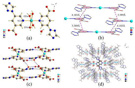 (a) Coordination environment of Co(II) atom in complex 1, (b) π···π stacking interactions between the adjacent benzene rings, (c) intermolecular H bonds for complex 1, (d) supramolecular framework of complex 1 formed by H bonds and π···π interactions (viewed along a axis).