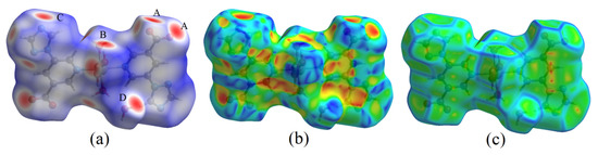The 3D Hirshfeld surfaces of complex 1 are illustrated in Figure 2, which maps dnorm, shape index and curvedness [21]. The dnorm Hirshfeld surfaces displayed using a red–white–blue color scheme, where the red spots indicate the close contact interactions, white color indicate contacts around the van der Waals radius distance, and blue color is for longer contacts [19]. As shown in Figure 2a, the deep red spots on the dnorm Hirshfeld surface indicate the close contact interactions, which are mainly responsible for the significant intermolecular O−H···O and O−H···N hydrogen bonds, created by carboxyl groups (spot A), coordinated water (spot B), triazole nitrogen atoms (spot C) and lattice water (spot D). For the shape index plot (Figure 2b), the orange–red areas represent concave regions, indicating that there are hydrogen bonding or π···π stacking interactions in these areas. For the curvedness plot (Figure 2c), the flat areas of the surface indicate interactions between neighboring molecules. In addition, the flat regions above the benzene and triazole rings refer to the strong π···π stacking interactions between the aromatic rings of adjacent molecules.