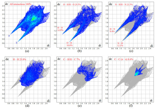 As shown in Figure 3, a 2D fingerprint plot was performed to identify important intermolecular interactions, which was further decomposed to highlight particular atom pairs’ close contacts. It is found that there are five kinds of intermolecular interactions, including O···H, N···H, H···H, C···H and C···C (π···π) interactions. The O···H/H···O intermolecular interactions comprise 29.5% of the total Hirshfed surface, which appear as two distinct spikes in the 2D fingerprint plot (Figure 3b). It can be inferred from the strongest spike that the O···H interaction is the shortest contact, with a minimum value of (de + di) around 1.7 Å [22]. The N···H/H···N interactions also appear as two sharp spikes, which comprise 21.5% of the total Hirshfed surface (Figure 3c). Apart from those mentioned above, the H···H interactions also have a large contribution to the total Hirshfed surface, comprising 23.8%. It is interesting that C···C interactions are found in the 2D fingerprint plot, which comprised 8.6% of the total Hirshfed surface (Figure 3f). The C···C interactions are mainly caused by the strong π···π stacking interactions between adjacent aromatic rings. From the 2D fingerprint plots, we can also find that the π···π stacking interactions have much longer contact distances when compared with hydrogen bonding interactions. The H bonding and π···π stacking information conveyed by Hirshfeld surface analyses are consistent with the crystal structure analyses.