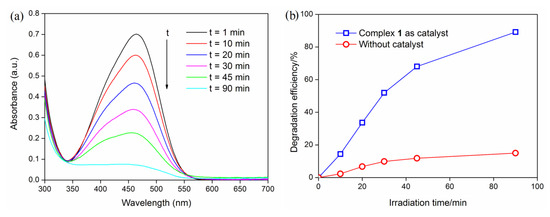 The removal of toxic organic dyes from contaminated water is very important from the perspective of environmental protection. The photocatalytic degradation of methyl orange (MO) in aqueous solution by complex 1 under UV irradiation is shown in Figure 4a. It can be found from the absorption spectra that the absorption intensity of MO solution decreased gradually with the reaction time under the catalysis of complex 1, and the MO is almost completely degraded after 90 min of light irradiation. Degradation efficiencies (D) for MO dye was calculated as D = (A0 − At)/A0 × 100% [25], where A0 is the initial absorbance of MO solution at λmax = 464 nm, and At is the absorbance obtained at t min. As shown in Figure 4b, the degradation efficiency of MO is about 51.9% after reacting for 30 min, and is up to 89.2% after irradiating for 90 min, which indicates the high catalytic efficiency of complex 1. In contrast, the degradation efficiency of MO is only 14.9% after irradiating for 90 min in the absence of complex 1. In addition, we measured the XRD pattern of 1 after the photocatalytic experiment, which was identical to the corresponding one of the original compound (Figure S1), indicating that the crystal structure of complex 1 was stable after photocatalytic reactions. The catalyst was reused three times to study its reusable performance, as shown in Figure 5a. The catalyst retained favorable photocatalytic efficiencies after reused for two cycles, with the degradation efficiency of MO decreased from 89.3% to 80.5%. However, after being reused for three cycles, the degradation efficiency of MO decreased to 65.2%.