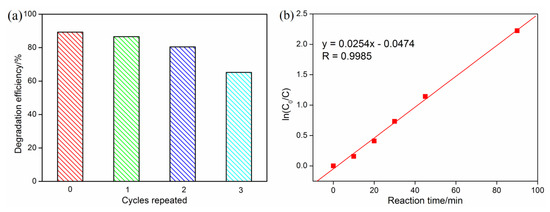 (a) Reusable degradation activity of complex 1 (irradiation time 90 min, the catalyst was centrifuged, filtered and dried for the next experiment); (b) pseudo-first-order kinetics for the degradation of MO under UV light.
