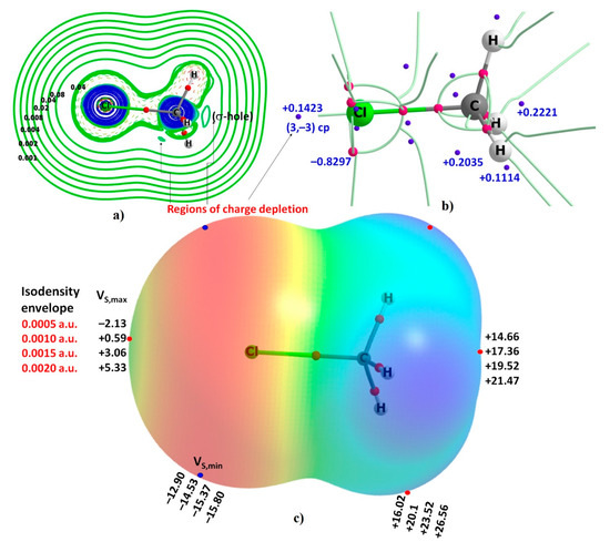 (a) The Laplacian of the charge density plot of CH3Cl. (b) Selected critical points of the Laplacian of the charge density (values in a.u.). (c) The 0.001 a.u. isodensity envelope mapped potential on the surface of the CH3Cl molecule. Values of potential extrema (VS,min and VS,min in kcal mol−1) obtained via mapping with various isodensity envelopes are also shown.
