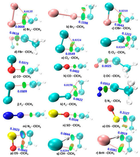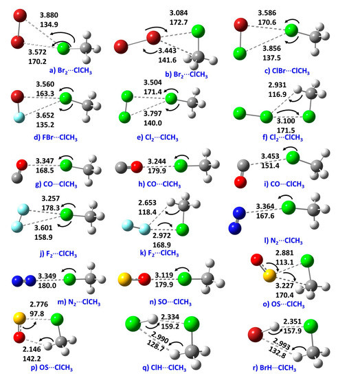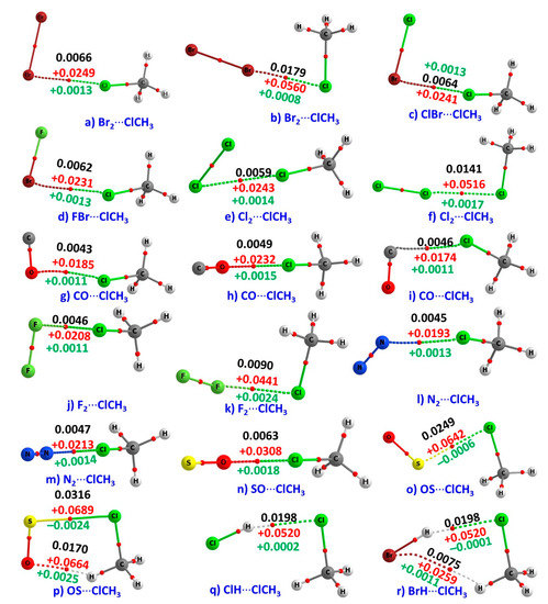 The QTAIM molecular graphs of the 18 binary complexes of CH3Cl studied are shown in Figure 3. They confirm the presence of primary interactions between the monomers in the complexes, as discussed above; there are well-defined bond paths and (3, –1) bond critical points between the bonded atomic basins in each complex. This is in good agreement with the recommendation of IUPAC [24,25,26]. The molecular graphs also indicate the possibility of secondary interactions in two cases: SO···H in (p) and Br···H in (r).