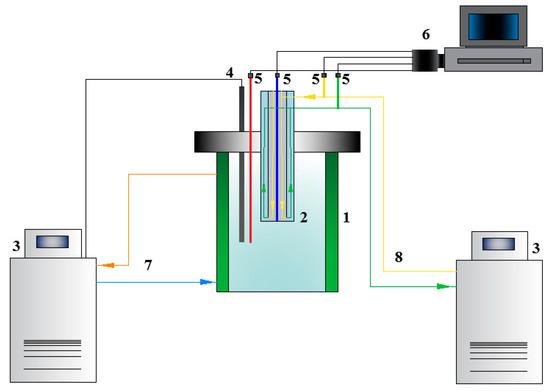 Experimental setup of static layer freeze crystallization: (1) crystallizer, (2) cold finger, (3) thermostats, (4) Pt 100 thermosensor, (5) thermocouples, (6) data processing device, (7) coolant streams circulating through jacketed vessel, (8) coolant streams circulating through cold finger.