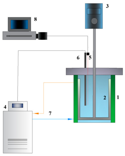 Experimental setup of suspension freeze crystallization: (1) crystallizer, (2) scraper, (3) mixer, (4) thermostat, (5) thermocouple, (6) Pt 100 thermosensor, (7) coolant streams circulating through jacketed vessel, (8) data processing device.