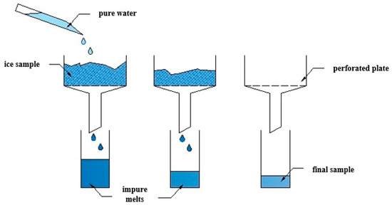 Approximately 15 g of surface floating ice crystals and mother liquor were taken directly from the reactor with a spoon and pressed on to the perforated plate in order to squeeze the mother liquor from the sample. Additionally, the sample was washed with 7 mL of de-ionized water at 0 °C to remove the remaining mother liquor. Washed samples were then left to partially melt and, with each step, the ice became more purified. The last fraction of ice crystals, with a mass of approx. 5 g, were considered to be pure crystals that had properly separated from the mother liquor, and its melt was used for the ice crystal purity analysis.