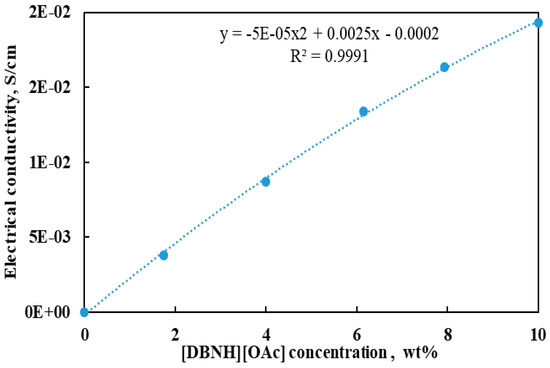 Purity of the ice samples —which is determined from the concentration of [DBNH][OAc] present in the ice crystals—was analyzed by the measurement of melted ice and mother liquor sample electrical conductivities with a Consort C3050 electrical conductivity meter. To obtain a correlation between electrical conductivity and concentration, the electrical conductivities of six solutions (0, 2, 4, 6, 8, and 10 wt.% [DBNH][OAc](aq)) were measured and are shown in Figure 4.