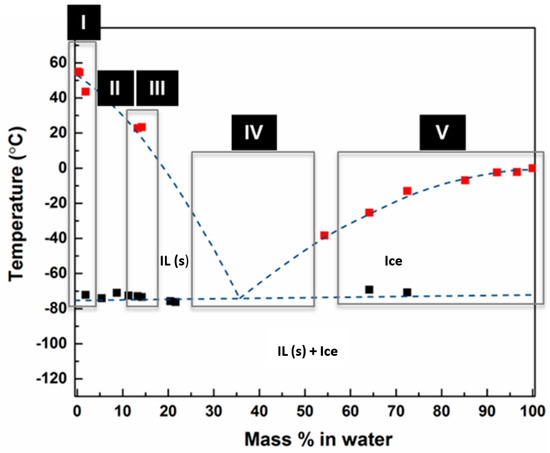 The binary phase equilibria between [DBNH][OAc] and water are shown in Figure 5. The phase diagram was constructed based on temperature transition data obtained for the ionic liquid–water mixtures (water content was varied over a range between 0.49 wt.% and 100 wt.%). As can be seen from Figure 5, the black dot highlights glass transition or eutectic temperature, which is at −73 °C and the red dots relate to the liquidus temperatures. For the mixtures of [DBNH][OAc]–H2O, where water content was less than 54.3 wt.%, only four temperatures were obtained by DSC, due to the ionic liquid glass-formation that occurs with such compositions. Consequently, the ionic liquid liquidus curve was plotted by extrapolation.