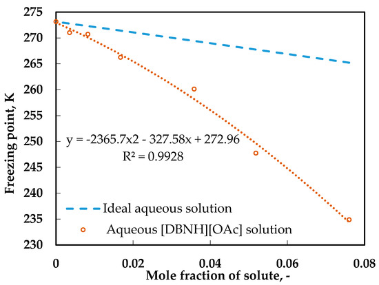 Calculated freezing points of an ideal aqueous solution (γ = 1) based on Equation (2) and experimentally obtained freezing points for an aqueous [DBNH][OAc] solution for the same range of dissolved solute were compared, as shown in Figure 6.