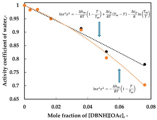 Water activity coefficients of aqueous [DBNH][OAc] solutions were calculated using Equations (1) and (2). Gmehling et al. [21] derived Equation (1) for the solubility of an organic solute in a solvent starting from the isofugacity condition. It can be used to estimate the activity coefficient of a sub-cooled liquid solvent as a function of the enthalpy of fusion, heat capacity difference between liquid and solid phase, and melting point of the solvent. When the system is close to its melting point, the last two terms of Equation (1) can be neglected and the simplified, Equation (2) is obtained. In the remainder of the article, Equation (1) is referred to as the activity coefficient equation and Equation (2) as the simplified activity coefficient equation.