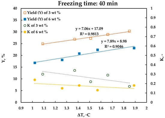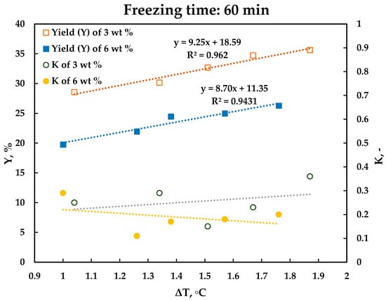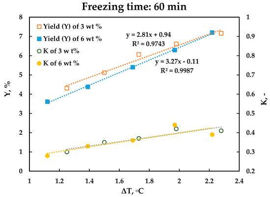 In order to make a comparison between crystal yields and distribution coefficients, the experiments for approximately the same set of five sub-cooling degrees for both aqueous [DBNH][OAc] solutions and both freezing times were carried out (n.b., sub-cooling degrees deviated in range between 0.01 °C and 0.09 °C). All experimental and calculated data can be found in the Supplementary Material (Tables S2–S5).