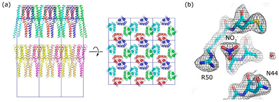 (a) Packing of the proteolytic fragment of NarQ in crystals in the space group I4. Symmetry-related molecules are colored differently. The proteins pack in parallel in layers. The remaining space between the protein layers was not sufficient to accommodate the missing HAMP domains. (b) An example of the 2Fo-Fc electron density contoured at the 1.5 × r.m.s.