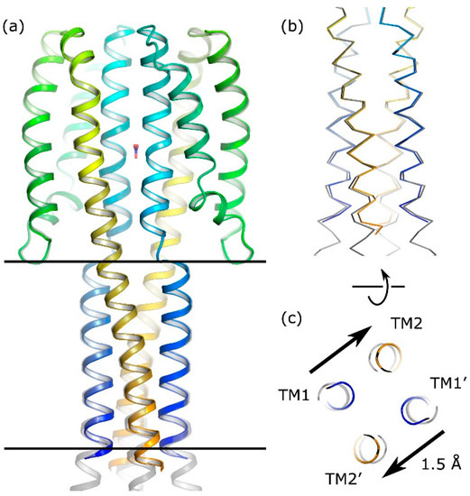 Differences in the transmembrane (TM) domain structures of the sensor–TM (rainbow coloring) and sensor–TM–HAMP (grey) constructs. (a) Overall comparison. Black lines show the approximate position of the membrane boundaries calculated using the PPM server [26]. (b) Comparison of the transmembrane regions. (c) Displacement of the cytoplasmic ends of the TM helices in the sensor–TM structure.