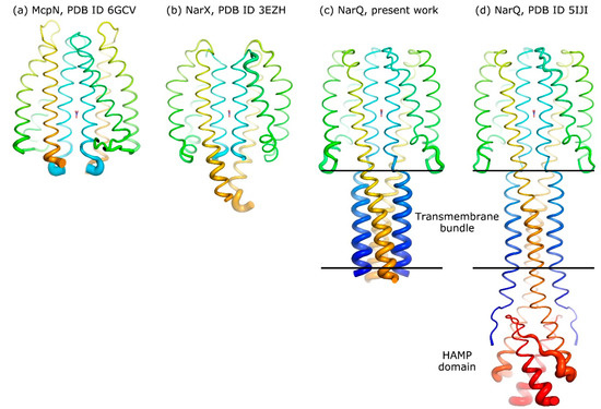 Disorder in the available crystallographic structures of fragments of nitrate-binding two-component signaling system (TCS) proteins. Thickness of the protein backbone tube is proportional to the B-factor. Rainbow coloring highlights the progression of the polypeptide chain from the N terminus (blue) towards the C terminus (red). (a) Sensor domain of McpN, PDB ID 6GCV [30]. B-factor range is 11–98 Å2, average is 23 Å2. (b) Sensor domain of NarX, PDB ID 3EZH [28]. B-factor range is 13–86 Å2, average is 30 Å2. (c) Sensor and TM domains of NarQ, present work. B-factor range is 20–192 Å2, average is 71 Å2 (20–122 Å2 and 50 Å2 for the sensor domain, correspondingly). (d) Sensor, TM, and HAMP domains of NarQ, PDB ID 5IJI [13]. B-factor range is 15–99 Å2, average is 34 Å2. Whereas the residues in the ligand-binding region are always well-ordered, the residues closer to the truncation site are progressively disordered.