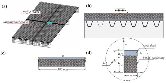 Steel deck fiber-reinforced asphalt concrete (FRAC) surfacing composite beam for fatigue analysis: (a) orthotropic local finite element model; (b) critical position of the vehicle wheel load; (c) composite beam equipment for fatigue testing; (d) cross-section of the double-layer composite beam.