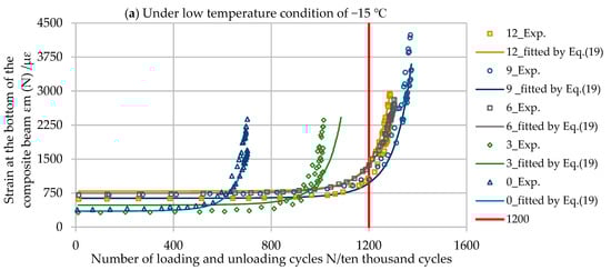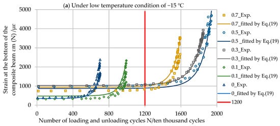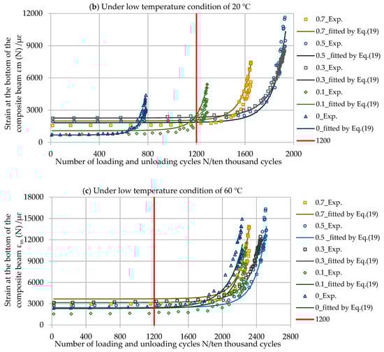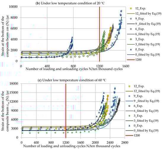 The relationships between the bottom edge strain of middle span on the composite beam and the number of fatigue load cycles N with a PAN fiber volume ratio of 0.4%, fiber lengths of 3, 6, 9, and 12 mm, and ambient temperatures of −15, 20, and 60 °C are presented in Figure 3a–c, respectively. The results were fitted using Equation (19), as shown by the dotted lines in Figure 3. This figure shows that the fitting results are in good agreement with the experimental results, indicating that Equation (19) effectively describes the relationship between bottom edge strain and fatigue load cycles N.