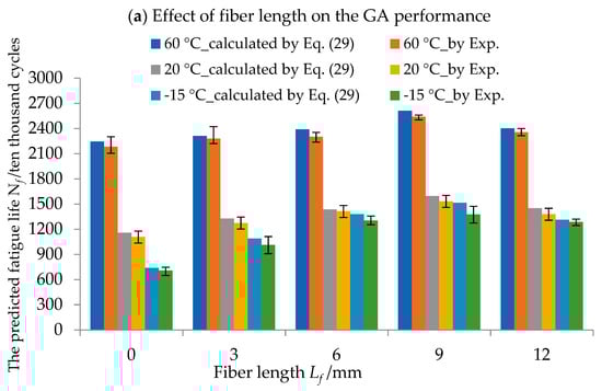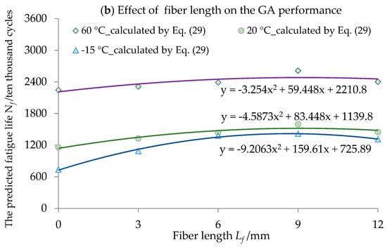 Comparison between the predicted and measured fatigue life under different temperatures and fiber contents (tested under standard axle load, BZZ-100) (unit: 10,000 cycles). (a) Effect of fiber length on the GA performance (the theoretically predicted value and test results); (b) Effect of fiber length on the GA performance.