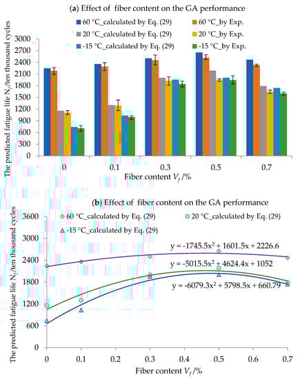 The calculation process is the same as that used in Section 5.1. Substituting the data of and (shown in Figure 5) into Equation (29), the fatigue life of steel deck GA-PAN surfacing under different temperature conditions and fiber volume ratios can be calculated. The theoretically predicted value and experimentally tested fatigue life values of steel bridge deck FRAC surfacing, which are compared in Figure 6, are in good agreement, and the error is within 12%. Figure 6 shows that, with the decreasing temperature, the synergistic effect of the fiber is more significant. Therefore, under the sensitive conditions for fatigue failure, i.e., low temperature, steel bridge GA-PAN surfacing mixed with fiber with a certain content ration can effectively alleviate the fatigue cracking of asphalt pavement. The best fiber volume ratio is 0.46%–0.48%, which meets the design requirements for the steel deck surfacing (Nf > 1200/10,000 cycles) at low temperature (−15 °C) and normal temperature (20 °C) [47].
