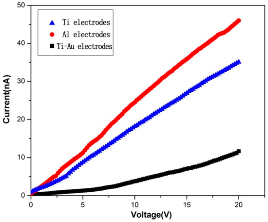 The current–voltage (I–V) characteristic curves of Ti, Al, and Ti-Au electrodes to (111) CdZnTe crystals.