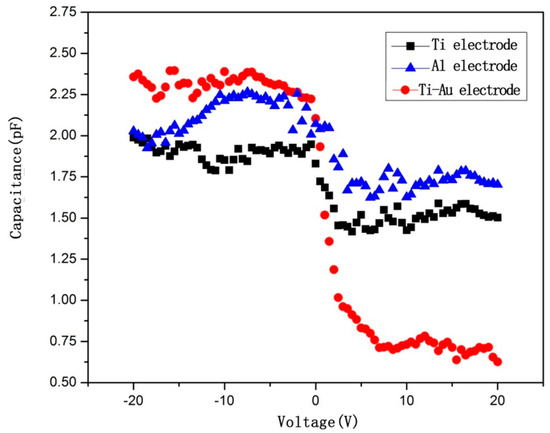 The capacitance-voltage (C–V) characteristic curves of Ti, Al, and Ti-Au electrodes to (111) CdZnTe crystals.