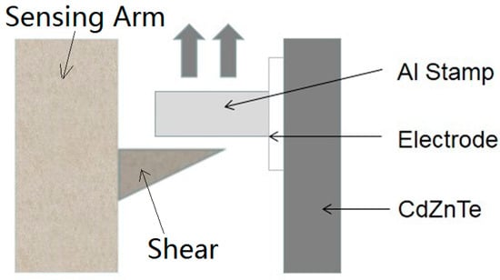 The adhesion strength between the Ti, Al, and Ti-Au electrodes and CdZnTe crystals was measured by a Dage PC 2400 microanalyzer. This experiment is destructive on contact electrodes by the shear-off method, which is generally used to measure the adhesion of two contact objects [18]. The test principle is shown in Figure 3.