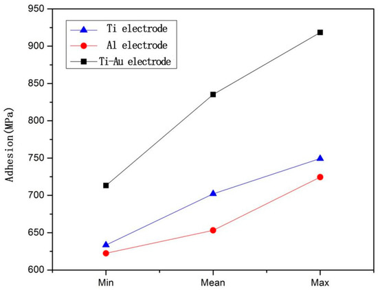 The adhesion strength between the Ti, Al, and Ti-Au electrodes and CdZnTe crystals was measured three times, and the average values were taken, which are shown in Figure 4. It can be seen that the adhesion between the Ti-Au electrode and CdZnTe crystal is significantly higher than that of the Ti and Al electrode, with the average adhesion strength of 835.3 Mpa.