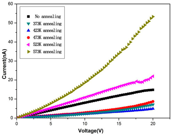 Figure 8 shows the I–V characteristic curves of the sample after rapid annealing at 423 K for different times. The I–V characteristic curves are fitted according to the ohmic characteristic formula, and the results are shown in Table 5. It can be seen that, at the annealing temperature of 423 K, when the annealing time reaches 6 min, the leakage current is the lowest and the ohmic contact performance is the best. However, when the annealing time continues to increase to 8 min and 10 min, the leakage current increases obviously and the ohmic contact performance becomes worse.