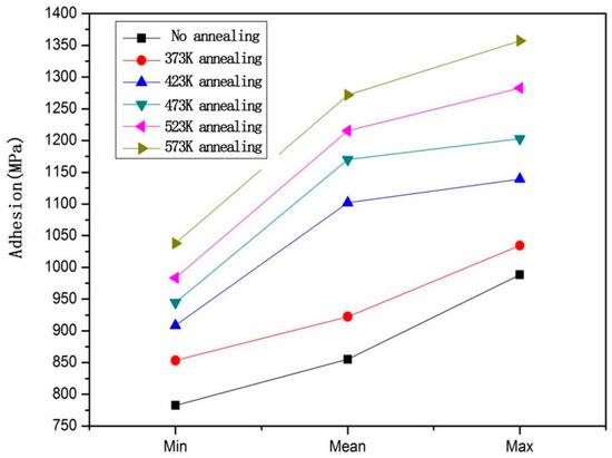 The relationship between the adhesion strength of Ti-Au/CdZnTe and annealing time at 423 K is compared, as shown in Figure 10. It was found that the adhesion strength between Ti-Au and CdZnTe was 1225 MPa after 6 min annealing, which is 10% higher than that after 4 min annealing and 50% higher than that without annealing. Then, when the annealing time is longer than 6 min, the increase rate of the adhesion strength of Ti-Au/CdZnTe decreases. Considering the effect of rapid annealing on the leakage current, ohmic characteristics, and adhesion strength of the Ti-Au/CdZnTe electrode, the optimal annealing temperature and time is 423 K and 6 min, respectively.