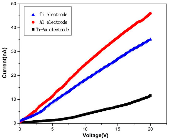 Figure 1 lists the I–V characteristic curves of Ti, Al, and Ti-Au composite electrodes, which are fitted according to the ohmic characteristic formula I(V) = aVb, where a is a constant, b is the ohmic coefficient, and b = 1 is the ideal ohmic contact. The fitting results are shown in Table 1. It can be seen that the ohmic characteristics of Al electrode are poor, and the leakage current at 20 V is the highest. The ohmic coefficient of Ti-Au composite electrode is the closest to 1, indicating that the ohmic characteristic is good and the leakage current is the lowest.