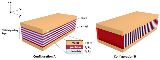 We consider metal-cladded planar THMM waveguides in two configurations as shown in Figure 1. THMM sandwiched between two perfectly metallic layers is composed of a number of unit cells, each comprising graphene and a dielectric layer of widths tg and td, respectively, forming the waveguiding structure. We distinguish two possible configurations of such a structure based on the geometrical orientation of THMM layers with respect to metallic cladding, further referred to as configuration A and configuration B, where the mode propagation direction (along the z axis, see Figure 1) is parallel or perpendicular to the interfaces between THMM layers, respectively.