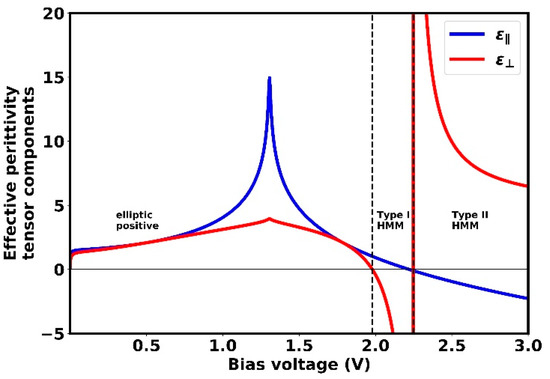 The basis for further analysis is formed by considerations upon the properties of the medium forming the guiding layers of both waveguide configurations, with a unit cell composed of six graphene monolayers, tg = 2.1 nm (0.35 nm per monolayer) and a layer of SiO2 of td = 2 nm. The effective dispersion of such structures can be controlled owing to voltage-sensitivity of graphene, which has been already demonstrated in reference [41]. Components of the effective permittivity tensor are obtained with the help of effective medium theory (EMT) and are presented in Figure 2 as functions of the bias voltage. By placing the bias voltage within respective intervals (separated in Figure 2 with dashed vertical lines), positive elliptic (ε⊥ > ε∥ > 0, i.e., uniaxial positive crystal), Type I (ε⊥ < 0, ε∥ > 0), as well as Type II (ε⊥ > 0, ε∥ < 0) hyperbolic dispersion types of the guiding medium considered can be obtained.